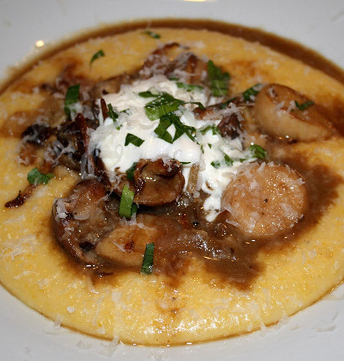 Creamy polenta topped with savory wild mushroom ragu and truffled mascarpone, prepared with Gustare White Truffle Extra Virgin Olive Oil and fresh herbs