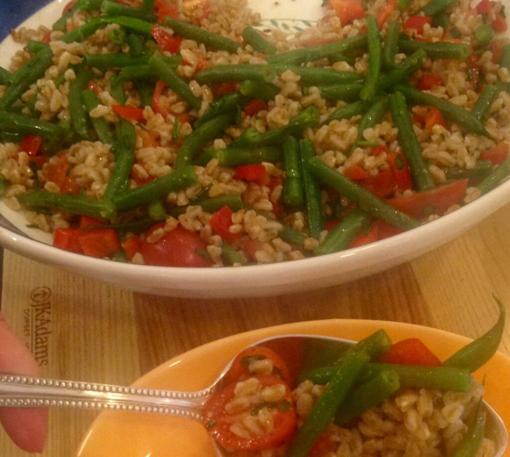 Set a large bowl of ice water beside the stovetop. Bring a medium saucepan of water to a boil, stir in 1 teaspoon sea salt and green beans to cook for 2 minutes. Remove with a slotted spoon to the ice bath for a couple of minutes. Remove and add to the cooled farro with the remaining vegetables and herbs.
