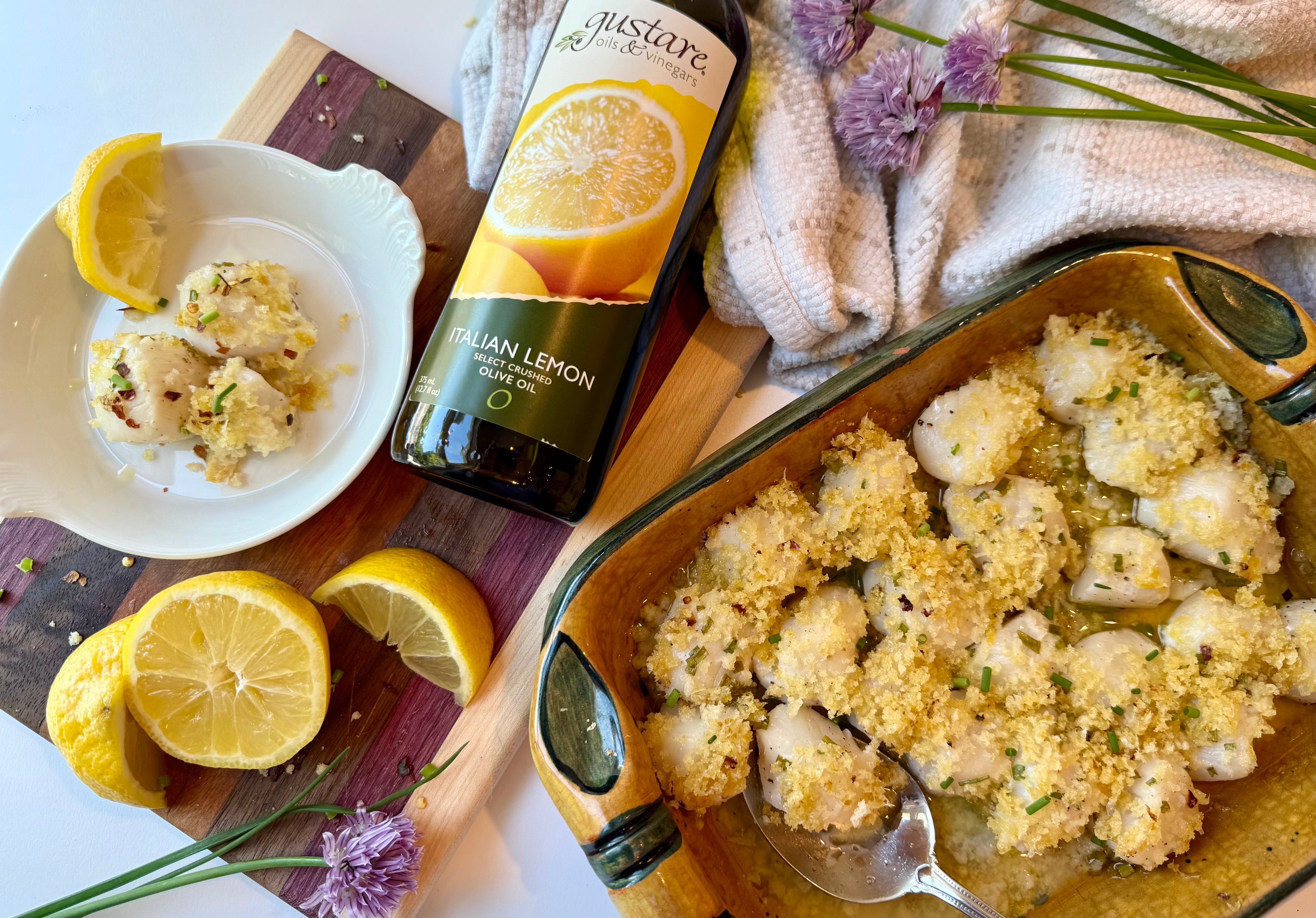 Fresh, lemony scallops from Chatham Harvesters with a buttery topping and a bit of crunch.