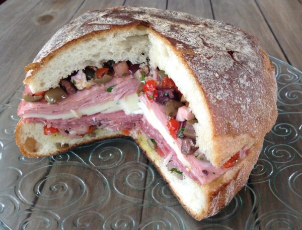 The wrapped muffuletta can be kept at room temperature for 2 hours and refrigerated for up to 2 days.