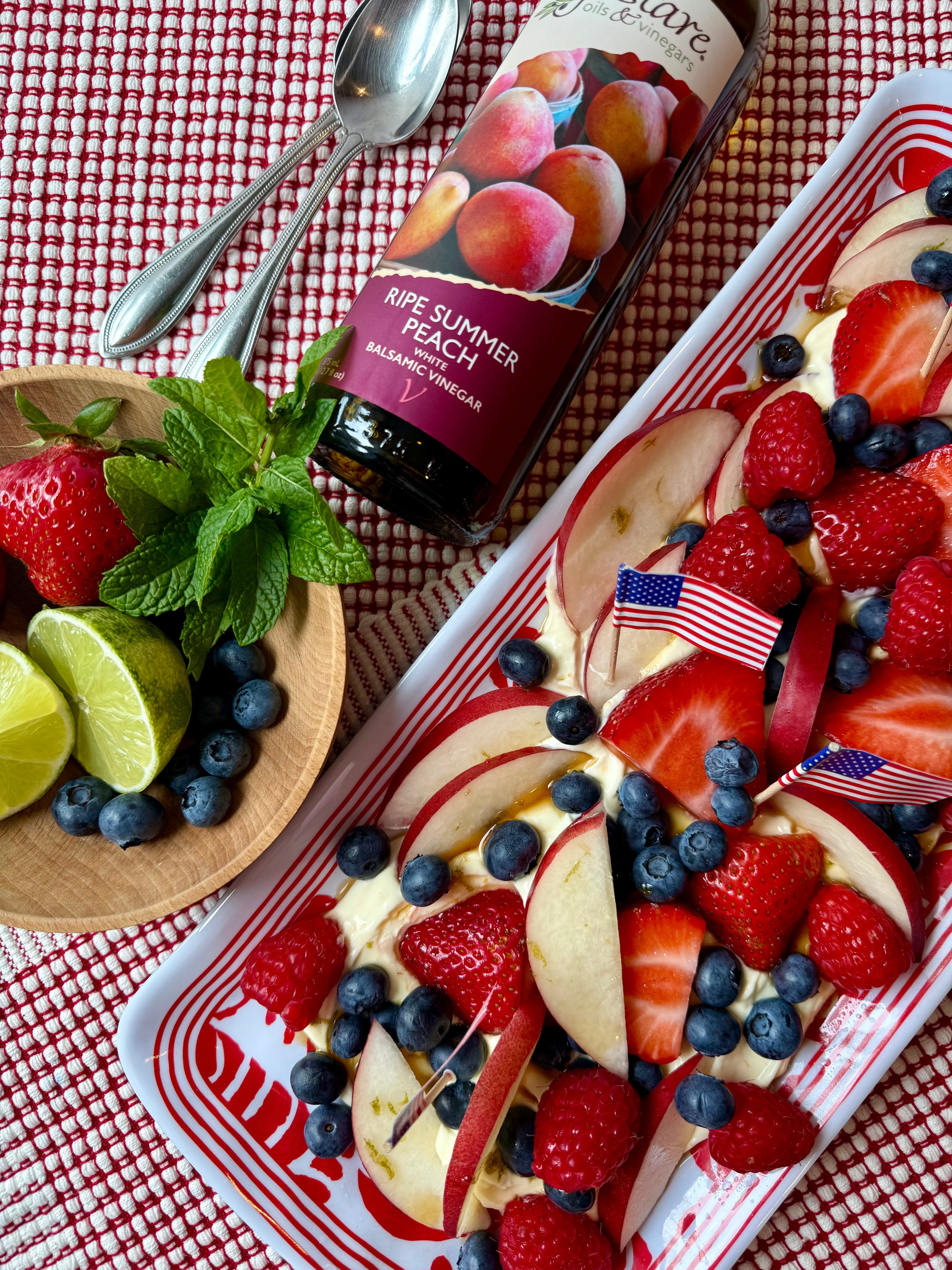 • Fresh strawberries and blueberries glazed with our premium Honeybell Orange Balsamic Vinegar, served in a delicate meringue heart for an elegant gourmet dessert.
