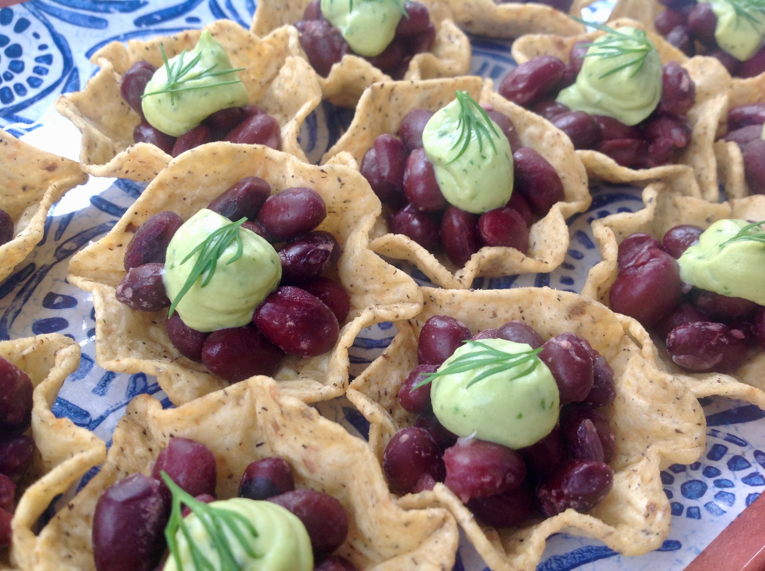 To each tortilla scoop, add a teaspoon of beans, top with avocado cream and a tiny sprig of dill for the finishing touch. Enjoy!