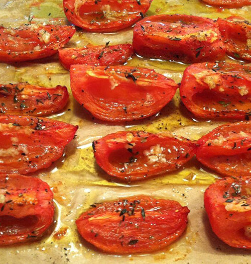 Using a paring knife, remove tomato skin, quarter and seed. Place on prepared sheet pan. Drizzle olive oil over tomatoes. Distribute pressed garlic evenly and sprinkle with thyme, oregano, salt and pepper.