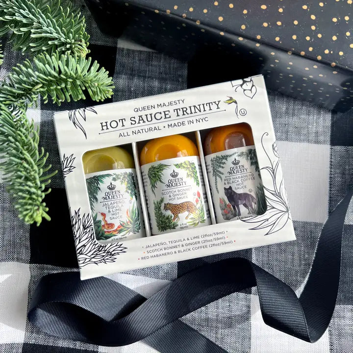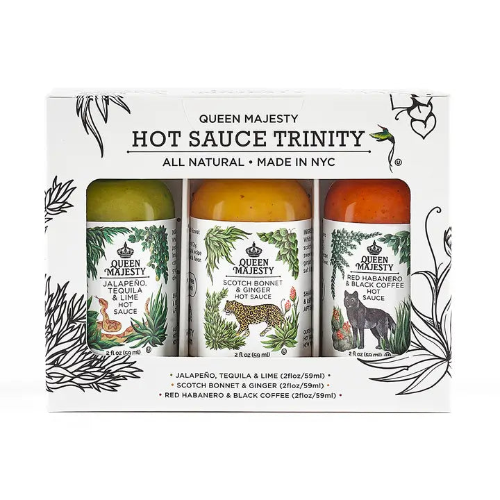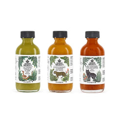 Three 2oz bottles of our core flavors, with heat levels ranging from medium to hot. These are great for customers to try the core QMHS range or to give to their favorite hot sauce lovers!