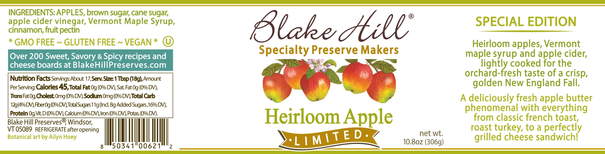 A traditional, elegant artisan butter with a maple accent, Limited Edition Apple Maple Butter has the flavor profile of heirloom apples - bold and crisp with juicy tartness. Slow-simmered in Vermont maple syrup, these apples become creamy and buttery with maple’s unique essence. Whether paired with classic cheddar, fresh baked scones, decadent pecan pie, or roast meats, Apple Maple Butter is one of Blake Hill's most versatile and beloved seasonal preserves.