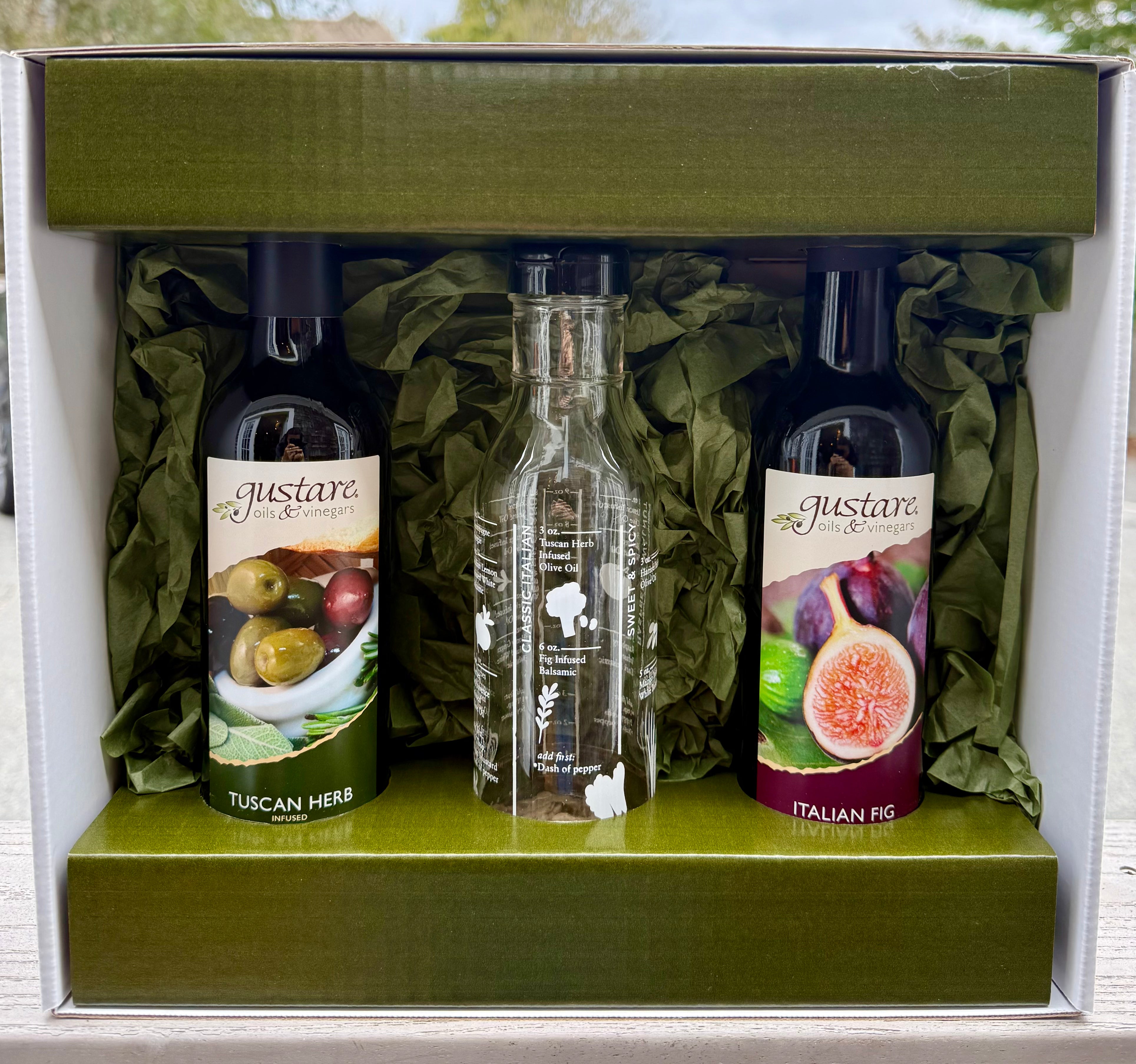 Tuscan Herb 375ml, Italian Fig BV 375ml, glass vinaigrette shaker with recipes in a large gift box