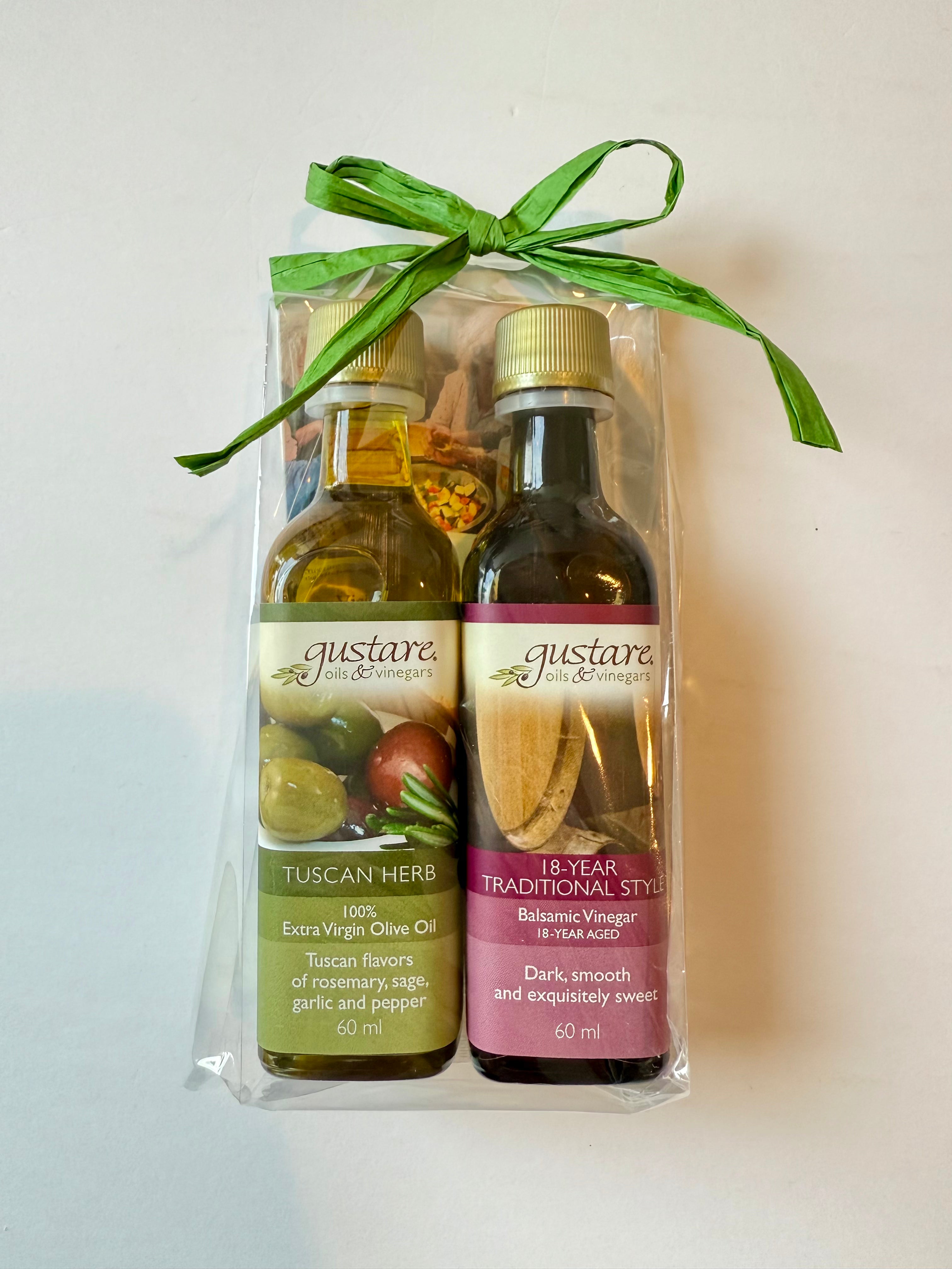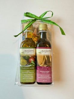 A gift pack of 60ml bottles of Tuscan Herb Extra Virgin Olive Oil and 18-Year Traditional Balsamic Vinegar. Perfect for easy vinaigrettes.